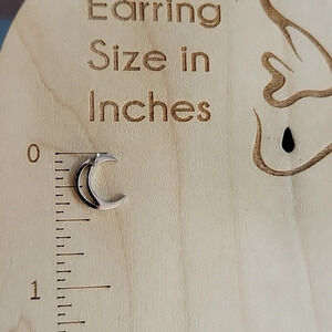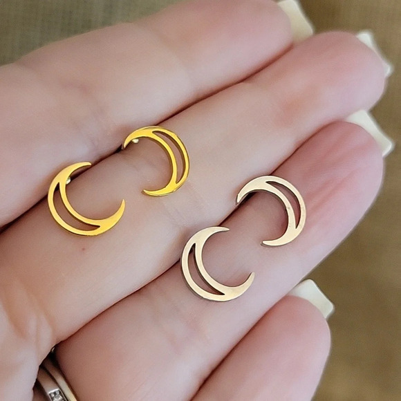 Small hollow crescent moon on polished stainless steel with hypoallergenic posts.