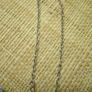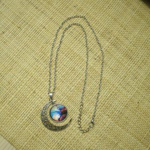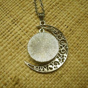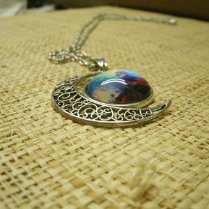 Openwork crescent moon pendant necklace. Has a dangle cabochon with a nebula. Silver metal alloy. 18 inch chain with adjustable tail. Lobster clasp closure. Pendant is 1 3/4 inches high including bail. New item from my local shop. Great for anyone who likes moon or astronomy/space theme items.