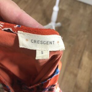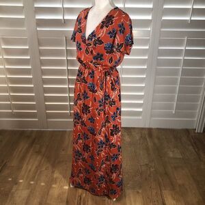 Beautiful floor length mock wrap/surplice dress. Fully lined. Elastic waist band with string tie. Split flutter sleeve. The color is a deep coral (almost burnt sienna) with turquoise blue and maroon floral print. Hangs very pretty. Well Made. Small. No holes or stains.