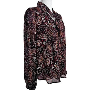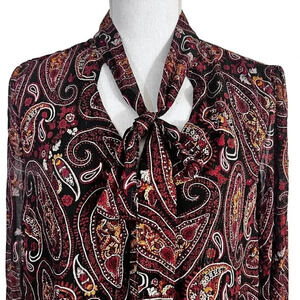 Crescent & Willough Metallic Paisley Blouse Cutout Neck with Tie Red Black White
