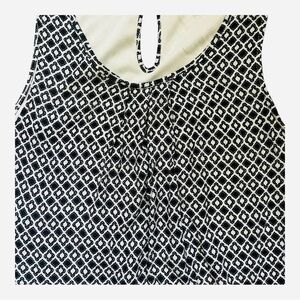 Stylish sleeveless dress with a geometric/ mosaic print. Features a blue and black pattern on a white background. Flowy, ruched front, scooped neckline, button closure in the back, lining.
