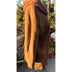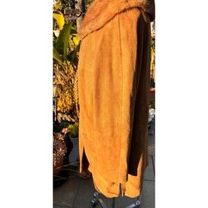 This is a Cresco Country Sportswear Suede Coat with a Fur Collar. It is well made and has a button up closure and two front pockets. Also, it has two reinforced side slits for comfort when moving or sitting.