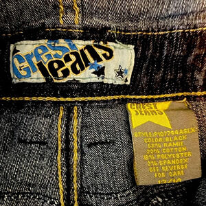 Crest Jeans 👖 size 13/14 dark wash, high waisted jeans. (Apple bottoms vibe) Six pockets, 5 button & zip closure. Accent vertical belt accent on back. Baroque floral print on buttons. 68 Raime, 22 cotton, 18 poly & 2 spandex. Great to wear with crop & corset tops. L:45.5/ Inseam:31/ waist:34
