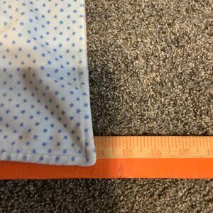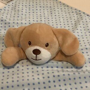 Soft and cuddly baby lovey blanket featuring a plush puppy head. Made of 100% polyester with a charming blue star pattern.