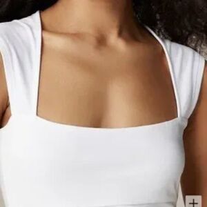 This style has a face-framing, square neckline, sweet cap sleeves and a slimmer fit all the way through. Plus, it's crafted from our stretch cotton-blend fabric, which is lightweight and breathable while stretching in all directions for a streamlined fit and feel.