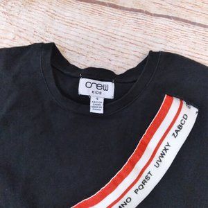 Elastic with alphabets across chest decor. Short sleeves. Crew neck.