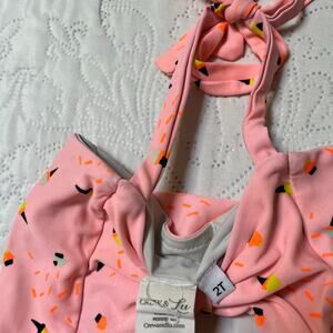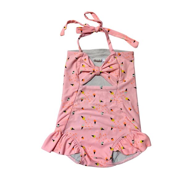 Crew & Lu one piece swim suit in colorful neon ice cream cone print. Halter retro style with adjustable tie top, ruffle skirted bottom, and cutout and bow details. Good condition, some pilling. Size 2T.