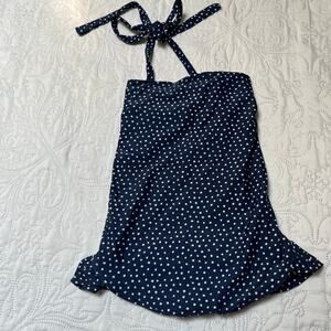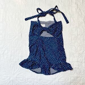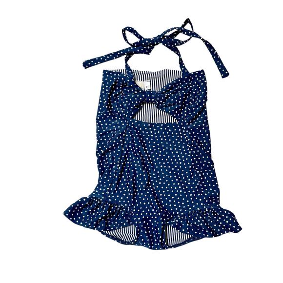 Crew & Lu one piece swim suit in navy blue polka dot print. Halter retro style with adjustable tie top and cutout, ruffle skirted bottom and bow details. Very good condition, light wear. Size 4T.