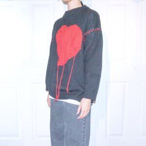 Crew Neck Oversized Knit Sweater, Alfrec Eden, Heart Stitch Design, Blue & Red