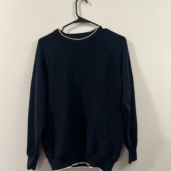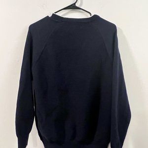 Crew neck sweater, guys. Black or the darkest blue humankind has lain its eyes upon. Size L