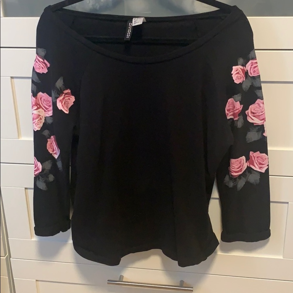 Super cute rose design on sleeves. Cuffed sleeves and nice material!