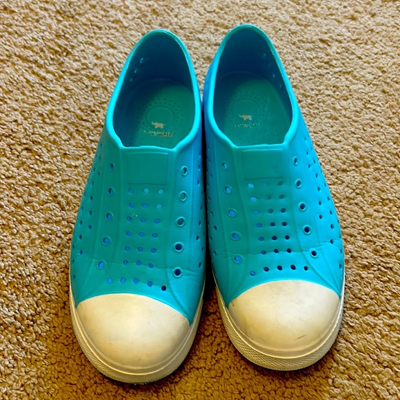 Vibrant blue with orange detail. Great condition on the shoes. Perfect for days at the beach or wearing to school. Incredibly comfortable.