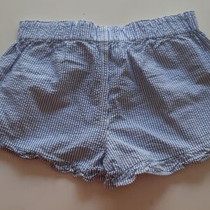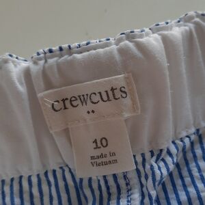 Crewcuts size 10 blue and white stripe seersucker shorts. Elastic waist. Pockets. Smoke free pet friendly home. Please see pictures for measurements. Excellent pre-owned condition. Shorts ruffle seersucker blue white 10 Crewcuts
