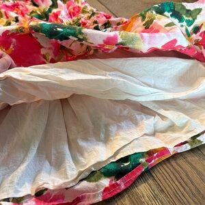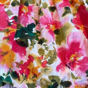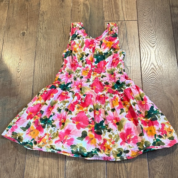 Vibrant floral sleeveless dress with a gathered waist and full skirt. Bright pink blooms with green and yellow floral details.