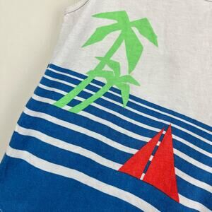 J. Crew Kids Collectible Beach Tank Top. Toddler boy size 4-5 years. Sleeveless white shirt with blue and white ocean stripes, red sailboat, yellow sun, and green palm tree. So cute for summer!