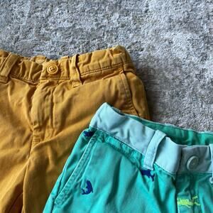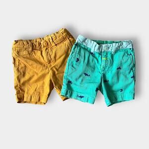 J. Crew Boys Chino Shorts Bundle. Toddler boy size 3T. Adorable, preppy lot of two shorts. One golden mustard yellow pair and one green with embroidered critters (sharks and frogs). Adjustable tabs in waist. Some wear/marks. Pair with a tee or polo for every day summer play!