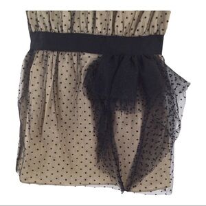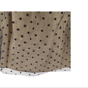 beige with black switch dot lace overlay ruffle detail on front up dress zip and hook closure on back caps sleeves