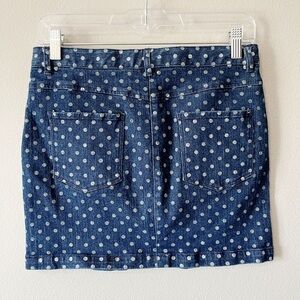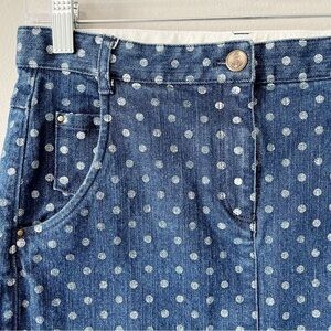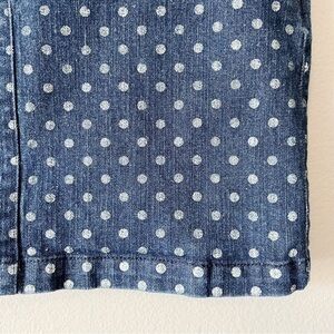 Crewcuts for J. Crew girls size 14 denim jean skirt in blue with white polka dots. Zipper fly and button closure. Functional pockets. Pre-owned, great used condition- there is writing on interior care tag.