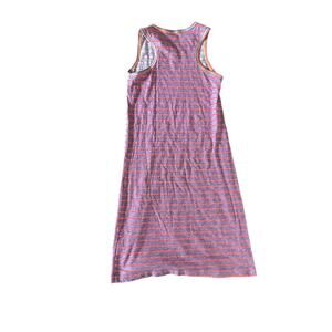 This adorable Crewcuts dress is perfect for any young girl! Made from 100% cotton, it ensures comfort and breathability, making it ideal for warm weather. The dress features a playful design with horizontal stripes in light gray and pinkish-red, complemented by a round neckline and racerback style for added flair. The armholes and neckline are trimmed with a white or light-colored edge for a clean, finished look.