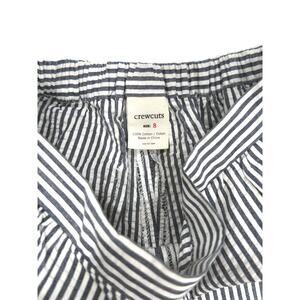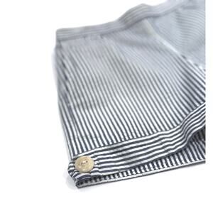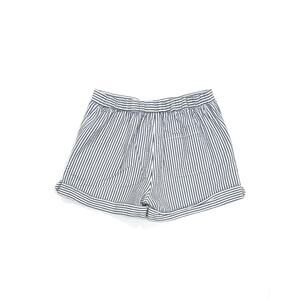 Navy blue and creamy white seersucker striped shorts. Button and cuffed hem detail. Elastic back waistband.