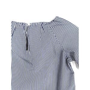 Navy blue and white striped scoop neck shirt with tie detail on 3/4th sleeves. Keyhole button closure on back.