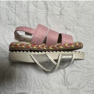 Crewcuts glitter slide sandals. White and silver cross strap shoes. Very good condition, minor wear to bottom. No size but very close to other side 9 sandals. Please review measurements, returns not accepted for fit.