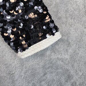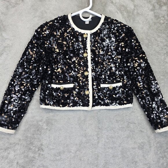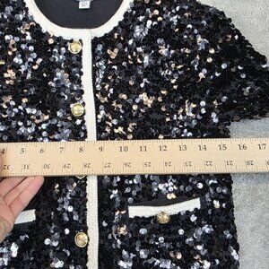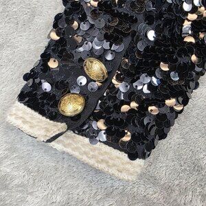 Details: Allover black and silver-tone sequins, contrast white braid knit trim at collar, placket, hem, cuffs, and faux front pockets, gold-tone decorative crest buttons on front and cuffs, two faux welt pockets.