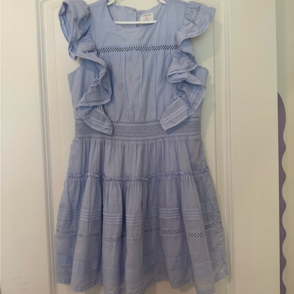 Adorable light blue dress with ruffle sleeves. Perfect for casual outings.
