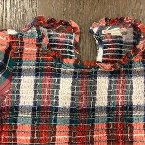 Vibrant plaid top with ruffle details. Features red, green, and white tones.