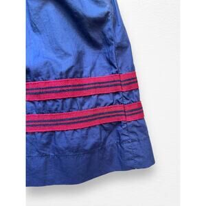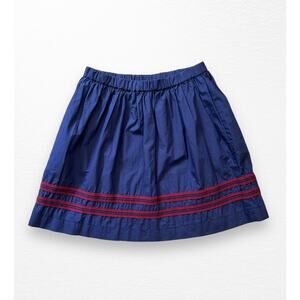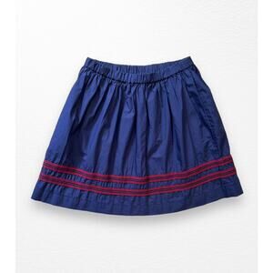 Navy blue with burgundy ribbon trim skirt from Crewcuts in size 12. Fabric content tag has been removed, but it's a lightweight fabric with a slight sheen- if I had to guess I'd say a cotton/poly blend leaning more towards cotton. Other than missing tag, skirt is in perfect condition.