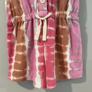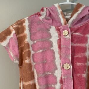 Excellent pre-owned condition, no flaws, Crewcuts by J. Crew girls size 4 beach cover up romper. This romper has a fun and trendy tie dye in brown and pinks. Chic tie-dye coverup with functioning buttons to waist for easy on and off at beach or pool. Material is a terry and mimics a beach towel absorbing water when tossed off after swimming. Hooded design and drawstring waist add detail and make this one piece romper easy to wear layered over swimwear or on its own for on-the-go vacation vibes.
