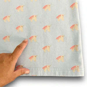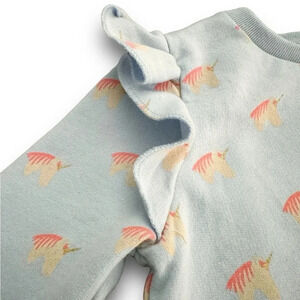 Straight silhouette; ruffles at the shoulders; soft cotton/poly blend; bright unicorn print. Pairs well with leggings in cool weather and bare legs in spring/summer.