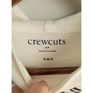 The Crewcuts Shirt in size 6-7 features a fun crab print in white and blue, perfect for a nautical beach theme. Made of 100% cotton, this pullover hoodie has long sleeves and a hood for added comfort and style. Ideal for boys, it is designed to be both practical and fashionable, making it a great addition to any young sailor's wardrobe. Made in Cambodia, this shirt is sure to keep your little one looking stylish while they enjoy some time by the seaside.