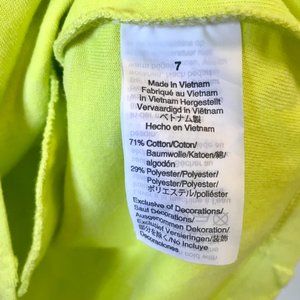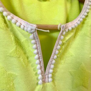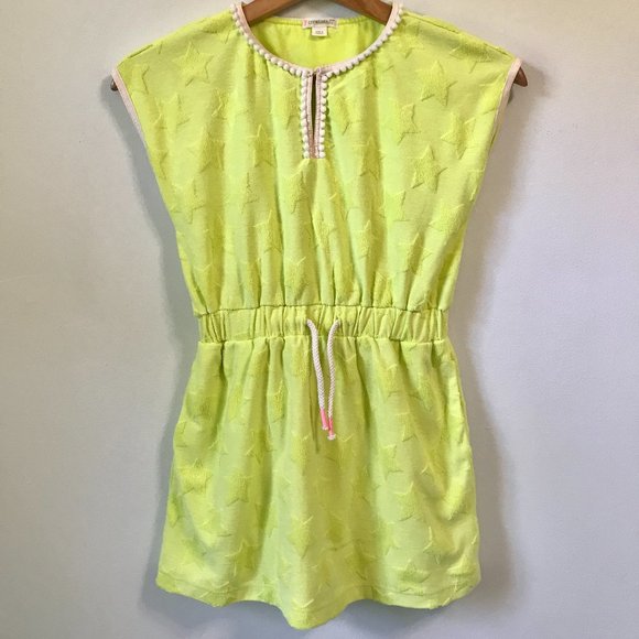 Super sweet neon yellow terry cloth coverup dress. Stars all over. White pom pom trim at neck. Pink stitching. White trim at cap sleeves. Pockets! Elastic waist, also ties. Perfect for the beach!
