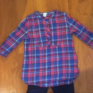 Flannel tee with variations of red and blue plaid design. Front bib button detail and 3/4 sleeves. 100% cotton, machine was tumble dry.