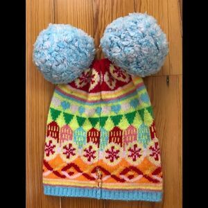 Super cute colorful beanie with two light blue pom poms. My daughter only wore it twice. 70% nylon and 30% lambs wool. Size S/M