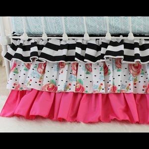 Includes: crib skirt, minky blanket, 3 crib sheets, rail cover, 2 decorative pillows, & changing pad cover.