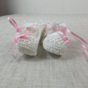 Crib Booties Baby Shoes Newborn White Crochet Knit Ribbon Soft Comfort.