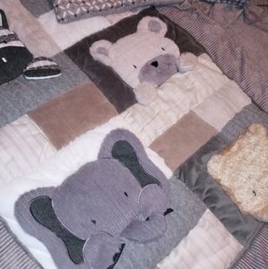 Excellent condition, mainly because my son never slept in his crib, neutral Grey crib set with animals. Includes: comforter, crib skirt, small basket, fitted sheet, lamp, diaper holder and crib bumpers(never used)