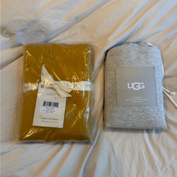 New light grey UGG and Natemia harvest gold crib sheet. Standard size 28x52.