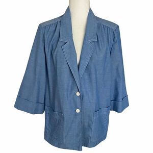 Cricket Lane Blue Blazer Button Front. Made in USA – VTG. Removable shoulder pads. Two front buttons and two front pockets. Sleeves are 3/4 length and cuffed. Lightweight fabric.