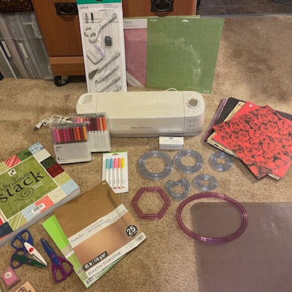 NIP personal trimmer, NIP Cricut tools, NIP 2 packages of 0.4 30 count Cricut pens, 1 NIP 0.4 Sorbet pens, 6 vinyl rolls, NIP Cardstock paper, 200+ design Cardstock paper, Creative Memory stencils with the cutters and more......