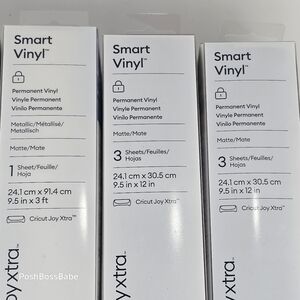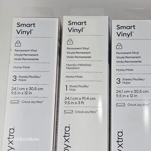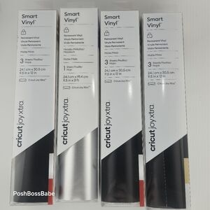 Cricut Joy Xtra Smart Permanent Vinyl Elegance Sampler Create colorful projects like a pro with the Cricut Joy Xtra Smart Vinyl Permanent - Elegance Sampler - a perfect long-lasting transfer vinyl that works without a cutting mat with the Cricut Joy Xtra machine and brings your crafts to life without getting worn out over time. Measuring (9.5in x 12in), each pack contains 3 sheets in White, Black, and Red, one each. Easily transfer your designs, labels, and stickers onto finished custom-decorative items. Just cut the pattern/figure stencil on the vinyl, weed away the excess, transfer it onto the transfer tape (sold separately), press down on the object of choice, and burnish it with a scraper or credit card. Voila! Your design transfers seamlessly, and permanently, onto the object. These vinyl sheets are easy to use and can transfer even the most intricate designs to smooth, non-textured surfaces with ultimate precision. Be it lettering your mugs, cups, and bottles, creating signs for home and car, making custom labels for the kitchen, or even for outdoor use. Joy Xtra smart Cricut vinyl Permanent is all-weather resistant, fade-proof, and water and UV-safe so you can wash your mugs/containers multiple times and your vinyl design will still stick around.