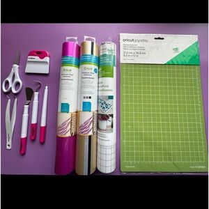 Cricut materials! Cutting board, shimmer permanent vinyl (fuschia, and sampler), transfer paper, green mat, and cricut supplies