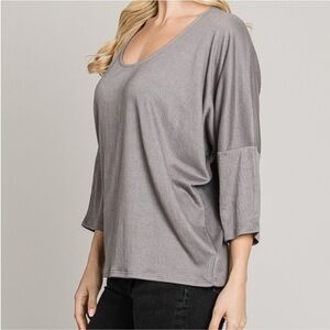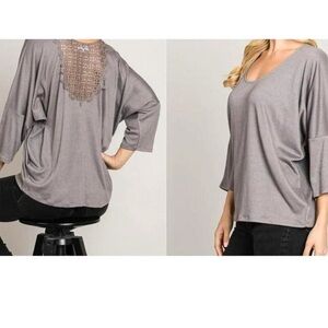 loose fit top, flowy blouse, lace back detail, gray crinkle knit, relaxed knit top, casual chic shirt, everyday wear top, boutique style, comfy drape shirt, scoop neck blouse, bracelet sleeve top, lightweight knit, feminine detail shirt, soft gray top, versatile casual blouse