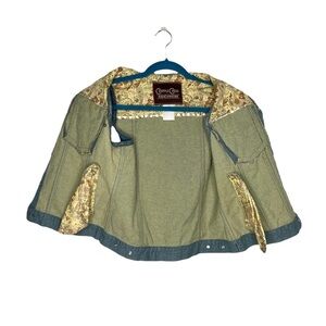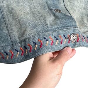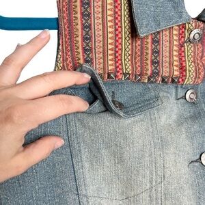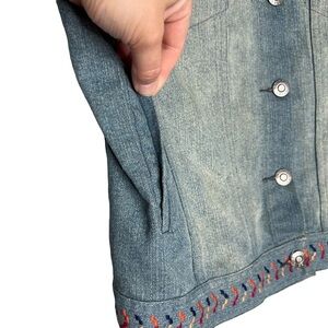 Cripple Creek Denim Aztec Southwest Studded Button Front Vest. Size small and in great preowned condition. There is some yellowing around the collar but based on the factory fading on the rest of the vest, I believe it’s intentional. Branded silver buttons. Red, yellow and orange Aztec fabric at shoulder area. Collared. Studded at chest. Embroidery at waist. 100% cotton but does have stretch. Note: the pockets are still sewn shut.