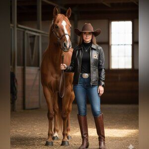 Authentic Cripple Creek 100% genuine leather jacket in women’s size Medium with embroidered Quarter Horse Congress crest. Crafted in dark brown distressed leather for a rugged yet stylish Western look. A collectible piece for equestrian fans, rodeo style lovers, or anyone who appreciates a timeless leather jacket.