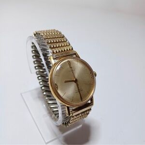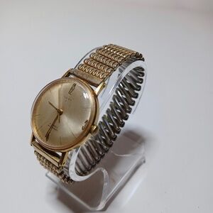 Crisp Vintage 1960s TIMEX 21 Jewel Bauhaus Sunburst Dial Manual Wind Working shows signs of wear such as scratches on case band and glass has some discoloration of gold tone as well see pictures for reference