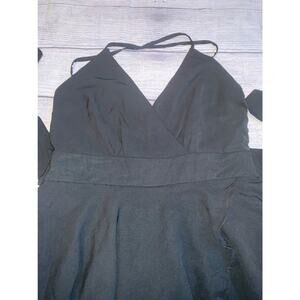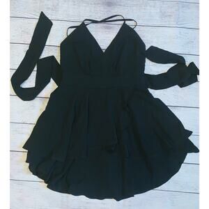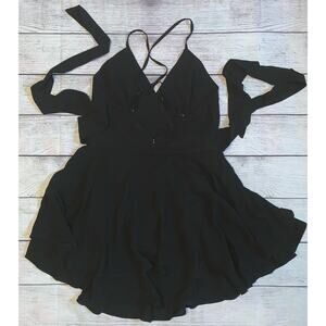 Details: Deep v-neck, camisole dress, faux crisscross front, open back, tie waist, asymmetrical ruffle hem, above the knee/mini dress, flowy, cute