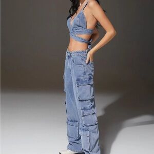 I do have the cargo pants in the photo available however the bottom hem of them are ripped a little from the one time I wore them. I am pretty sure they can be fixed since the pants are very long and have wiggle room for adjustment. If you are interested in purchasing them please ask for more pics and if you want I can add them to the purchase. It does look super cute paired together.
